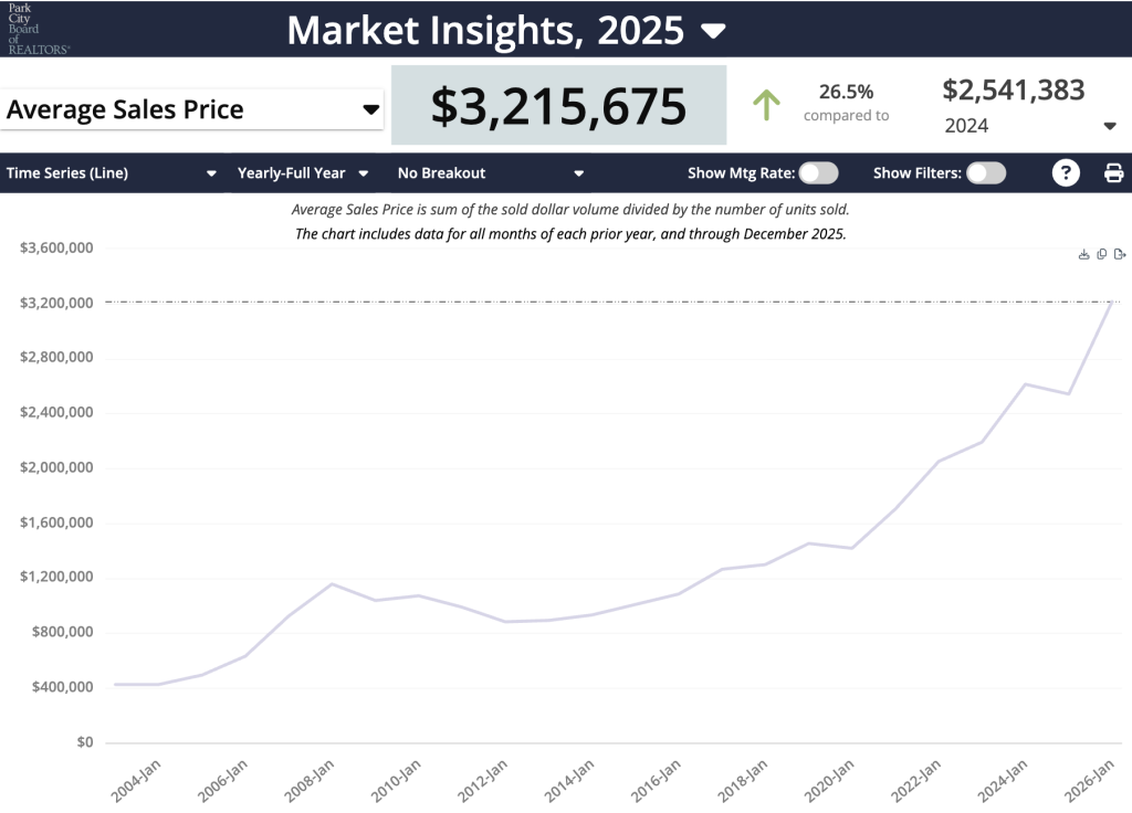 In my review of the data, one of the most compelling items I came across was the total sales volume for the Park City market: $3,270,341,034. This was an increase of 36.6% over 2024 and was only bested by 2021, when total sales volumes were just over $3.5B. This shows the Park City market is resilient, despite economic ups and the media’s non-stop negative coverage. It is remarkable to note that the sales volume between 2021 and 2025 was almost the same, yet the number of properties sold in 2025 was 1,025 versus 1,728 in 2021.